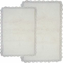 Create a look reminiscent of a French Country retreat in your bathroom with this set of two bath rugs in three classic, subdued colors. This traditional style bath rug set has been designed to bring a higher level of warmth and comfort to your bathroom decor. The handmade crochet edging detail gives an elegant design to complement distressed wood, crystal lighting and floral details for the perfect Provence powder room. Pair with vintage accessories for an effortless shabby chic feel. The heavyweight, water-absorbent construction gives a plush, luxurious feel. These reversible rugs are machine tufted from 100% cotton with handmade edging. Set includes 21 x 34 and 17 x 24 in. bath rugs.