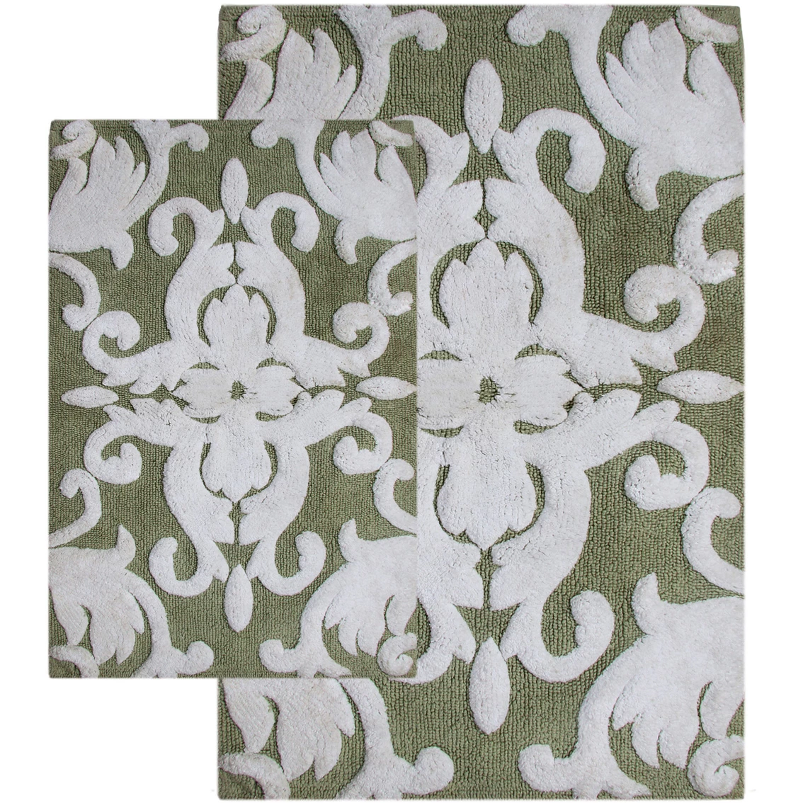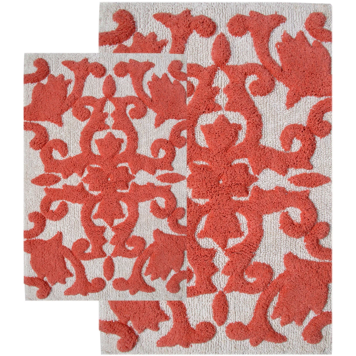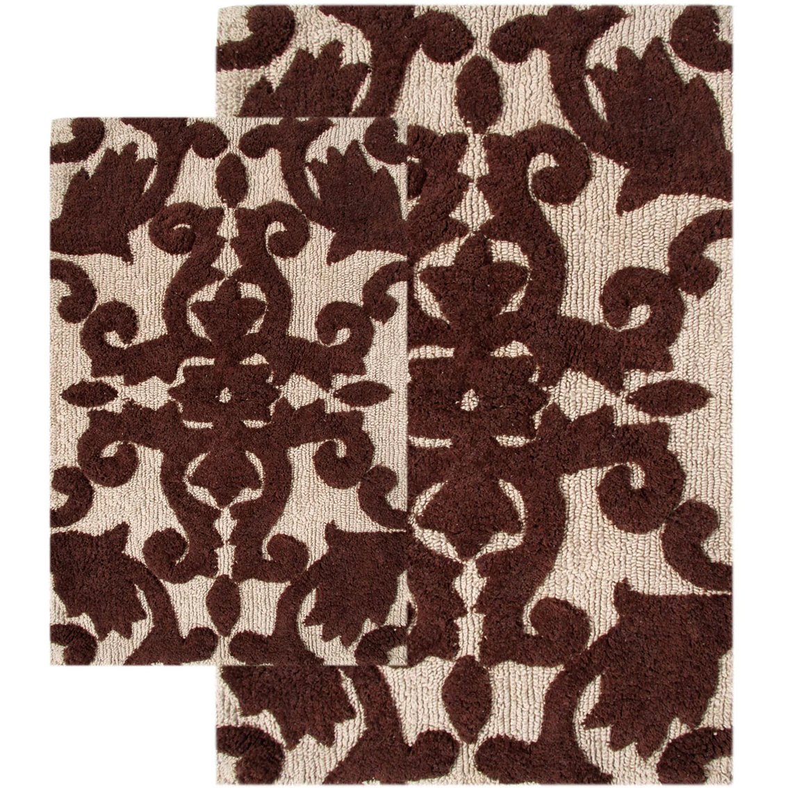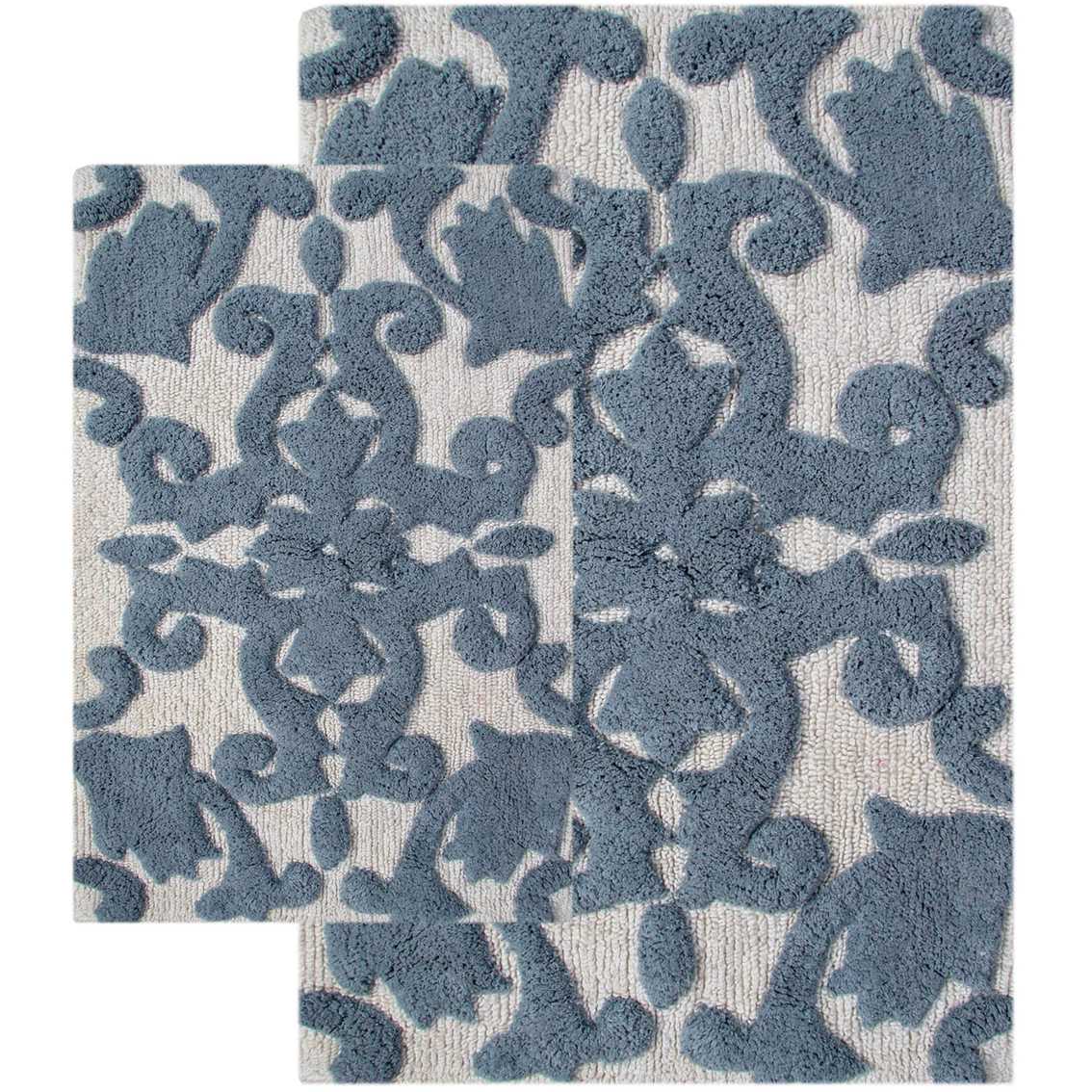 This bath rug set with scrolled design enriches any space with distinctive style. Your bathroom decor will take on an elegant tone with the addition of these Iron Gate rugs. Plush 100% cotton cushions your feet for pure comfort, and water-absorbent construction ensures lasting quality. Set includes one 20 x 32 in. bath rug and one 23 x 39 in. bath rug.