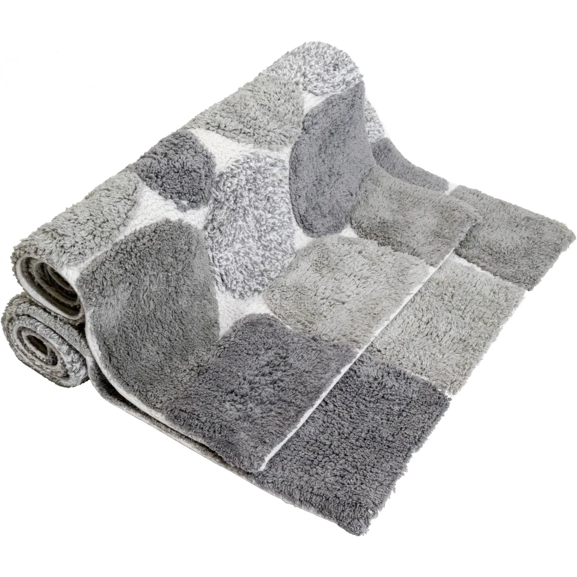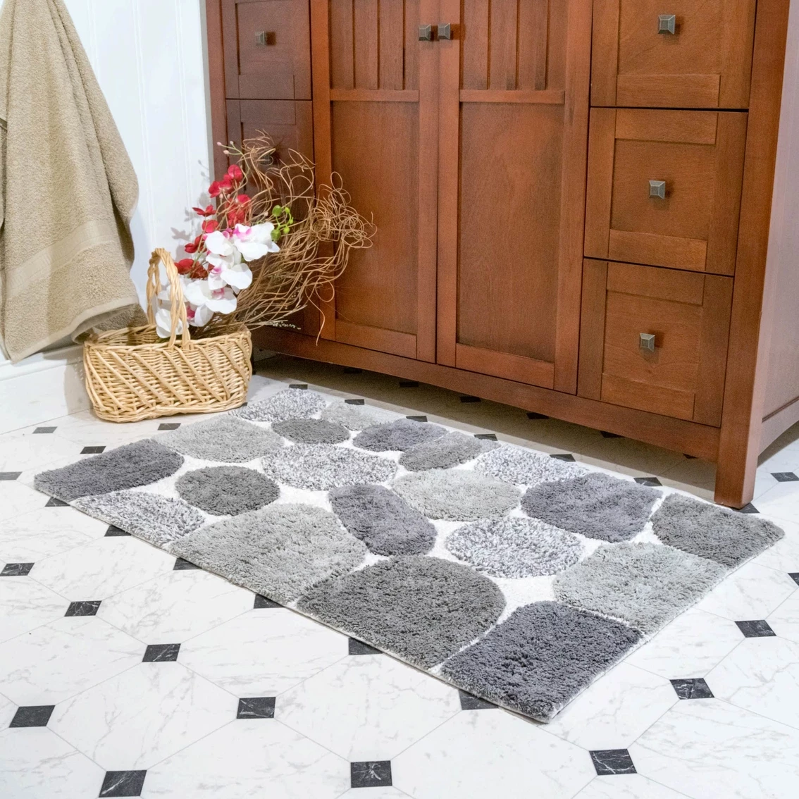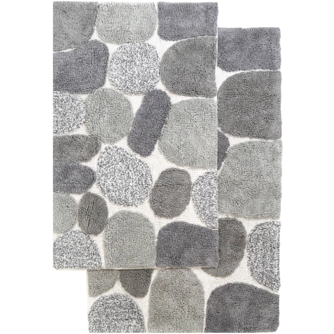 Add the feel of relaxation and the coolness of hues of beige to your bathroom with this Plush Pebble Pattern Bath Rug Set from Chesapeake. The light, dark and white colors of this grey bath rug set will surely be a welcome addition to your bath decor. The colors are made perfect by the pebble shapes of the design against grey. Set was designed to bring a neutral and slightly warm tone into your bathroom color scheme. Set includes 21 x 34 in. and 24 x 40 in. rugs spun of 100% cotton and machine-tufted with a lightly sprayed anti-skid back. Style: 26654.