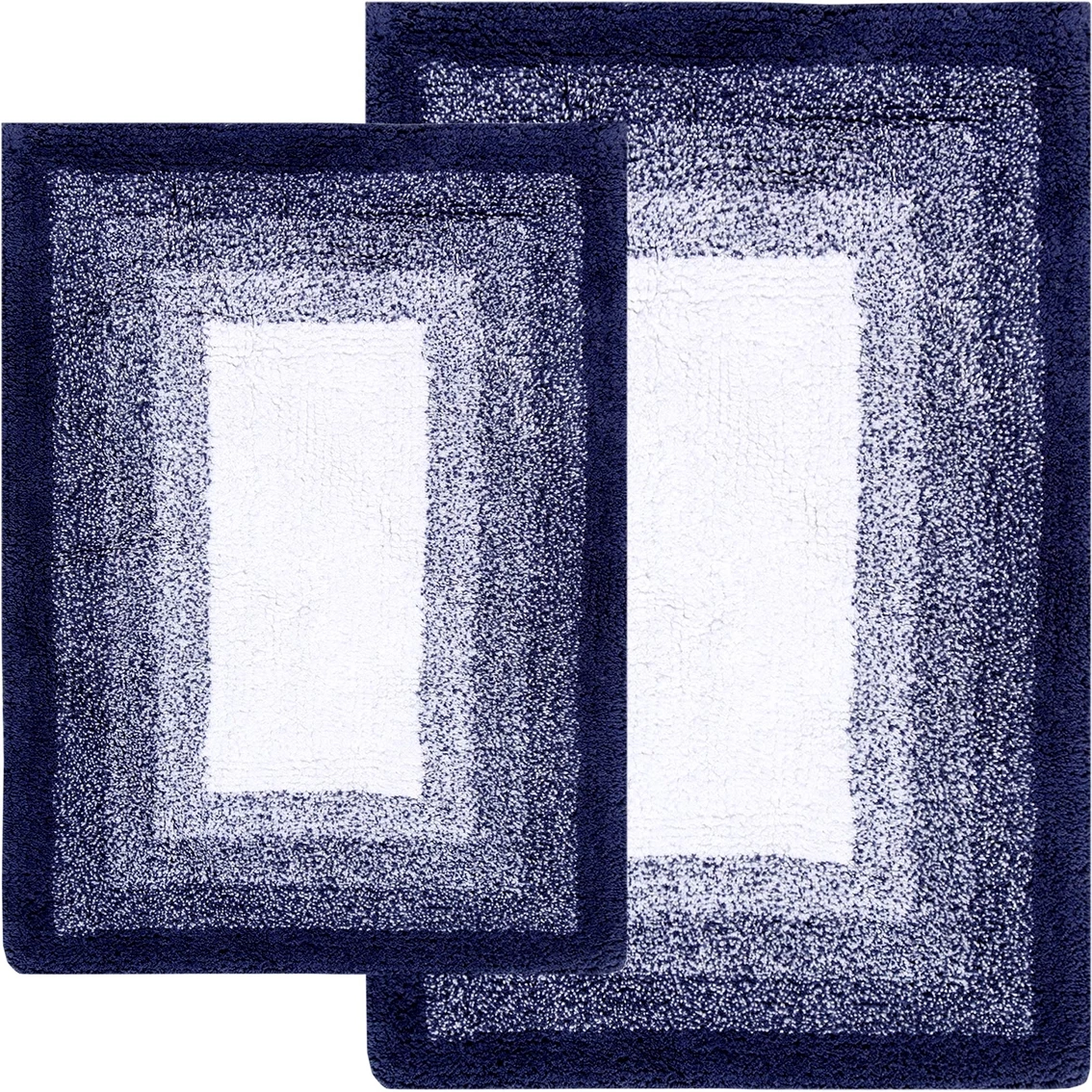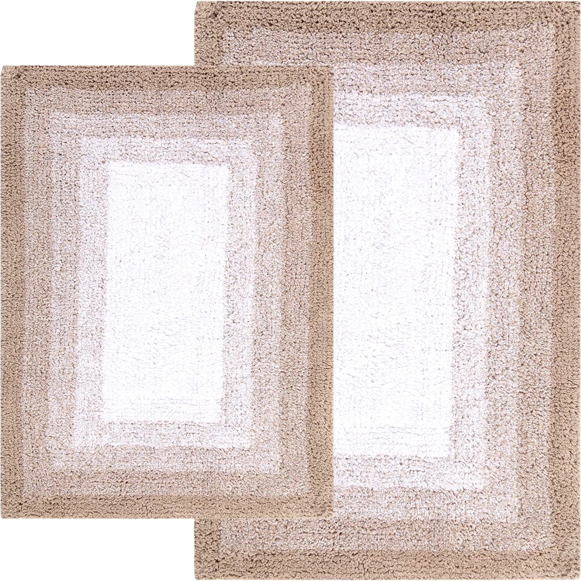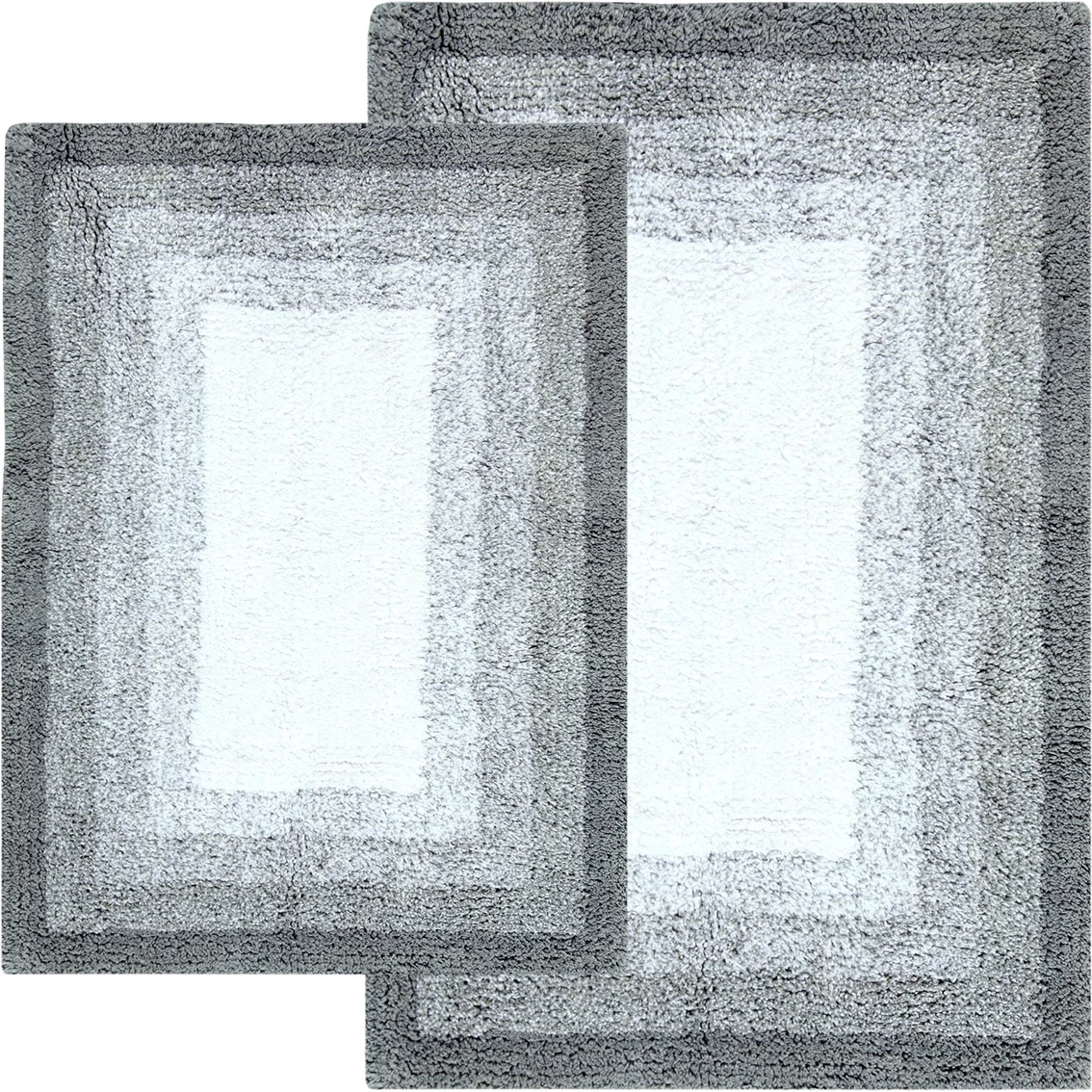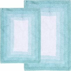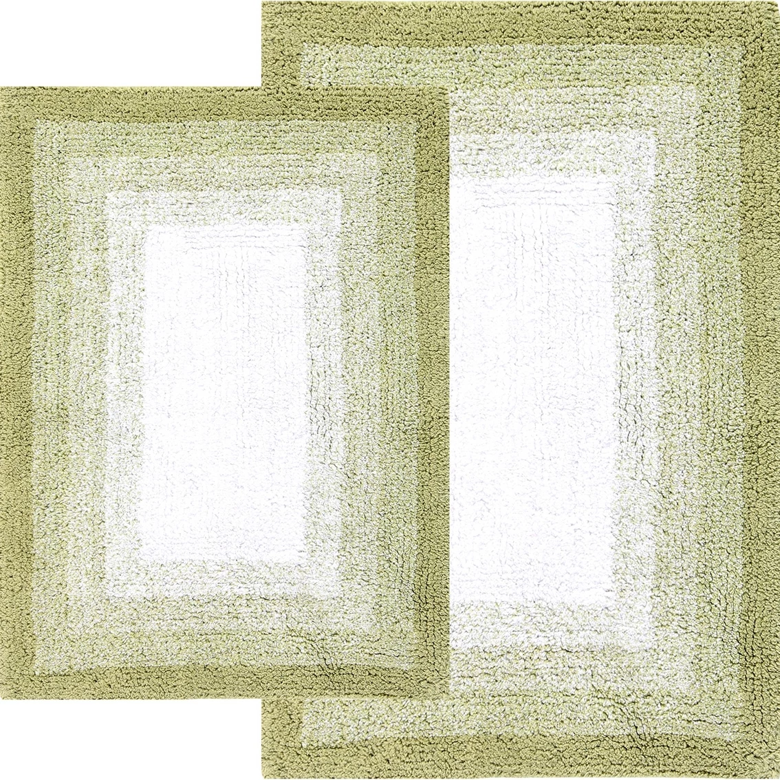 The set is reversible and is machine tufted from 100% cotton. The ombre effect of this green bath rug set fades from a minty green to a light gray. These reversible bath rugs reduce the need for frequent washing. Our Whitney collection of reversible rugs comes in a variety of complementary colors. Give your bath decor the upgrade it needs with this two piece bath rug set in green. Set includes one 21 in. x 34 in. bath rug and one 17 in. x 24 in. bath rug. Style: 1865.