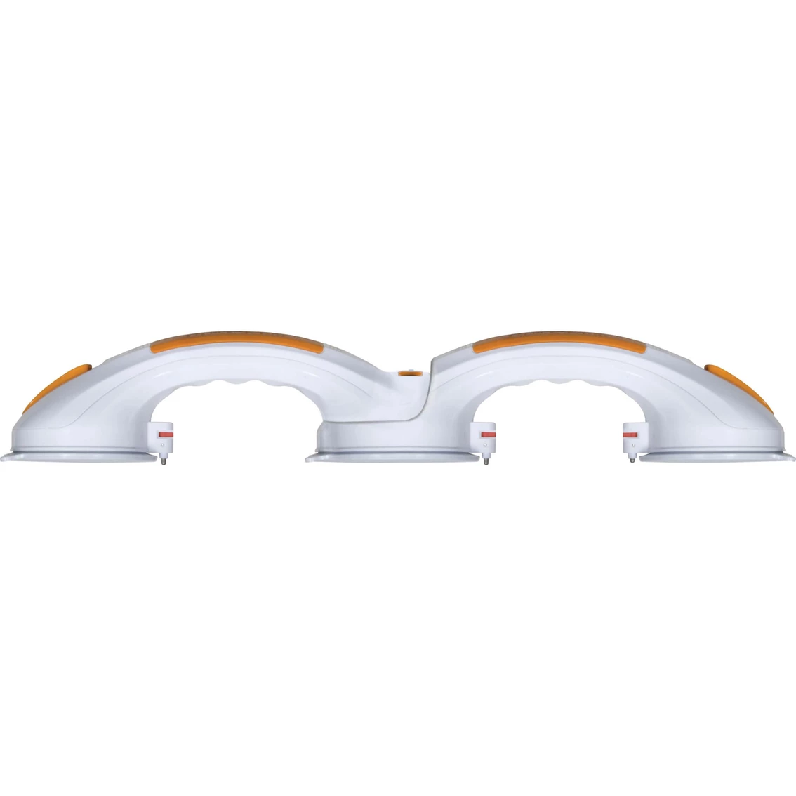 Release levers make installing and removing the suction-cup grab bars quick, easy and tool-free. Rotates to any angle. Will not damage property. Large suction cups provide an extremely strong hold. Red/green color indicator shows “safe secure” suction or “re-affix” suction. Avoid grout lines for proper placement.