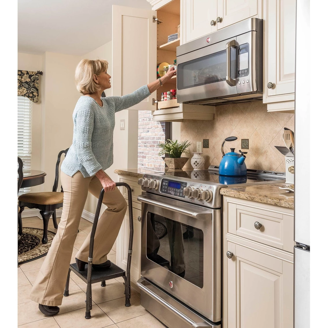 Safely and confidently reach higher items with this footstool. Its nonslip surface and nonskid feet ensure secure use. Great for items in upper cabinets or tall shelves, or even for children to use in the bathroom for reaching high sinks and medicine cabinets. This footstool provides the confidence that you or your loved ones will not slip when reaching.