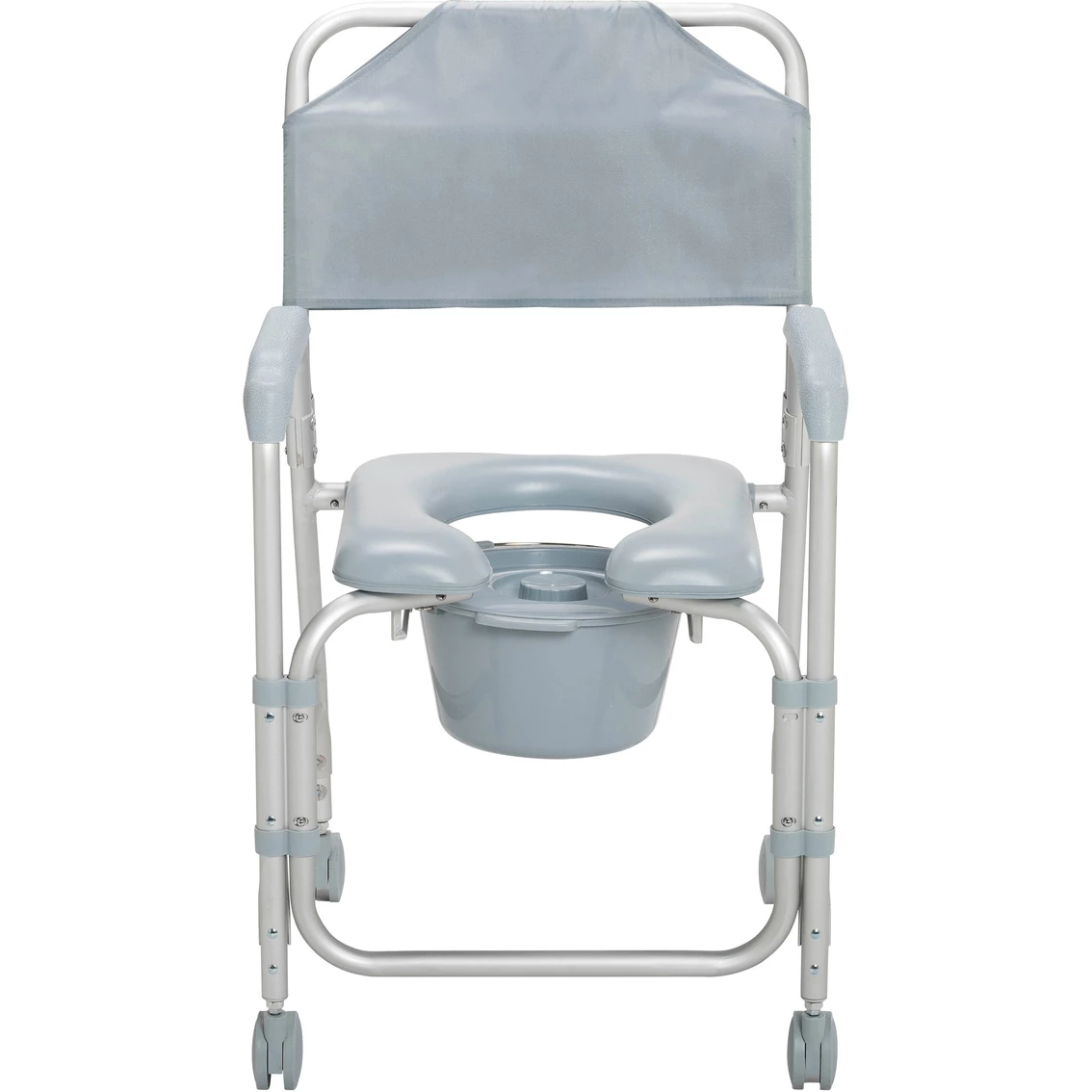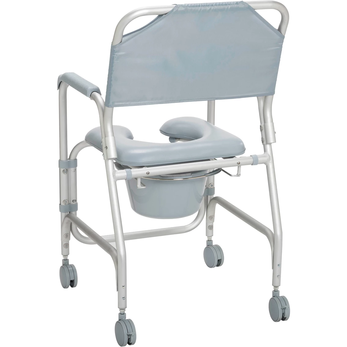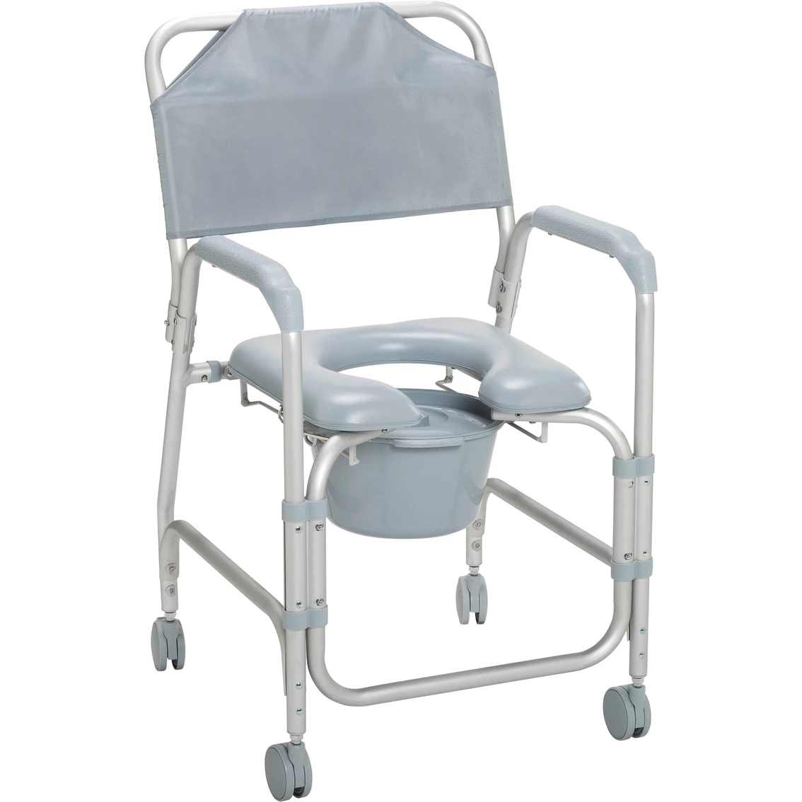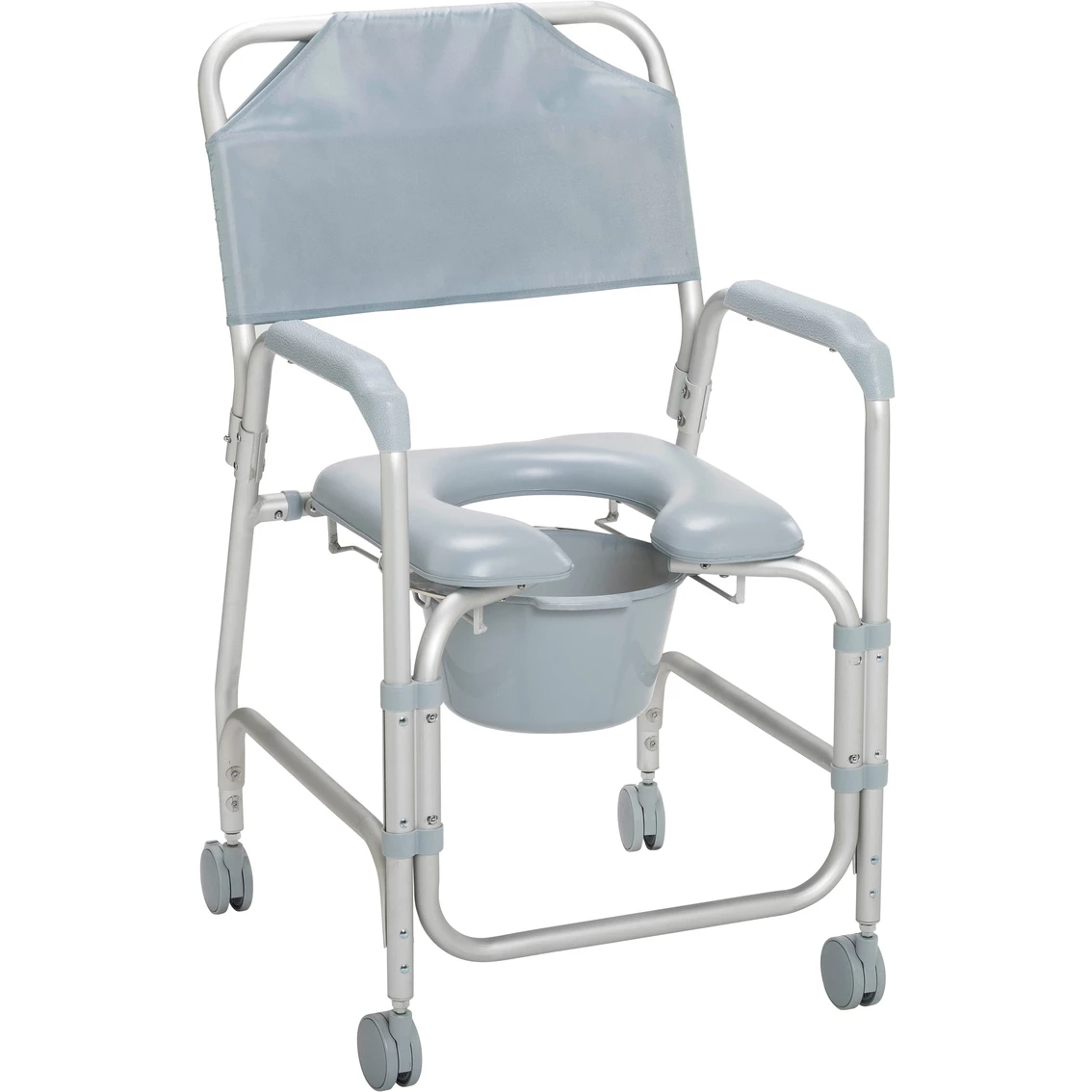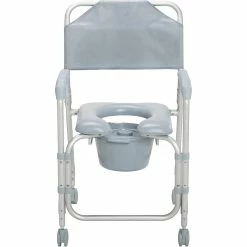 This lightweight portable shower chair commode with casters by Drive Medical is packed with features to ensure a pleasant and comfortable bathing experience. One of the greatest benefits is the ultra comfort padded seat, featuring an open front design making personal hygiene easy and convenient. When the shower chair is not in use the back and 12 quart commode bucket can be removed without tools making cleaning and storage simple. The frame is manufactured with lightweight rust resistant anodized aluminum. Easy to operate this shower chair commode comes equipped with 3″ non skid casters making transfer to an from any bathroom safe and secure. Model: 11114KD-1.
