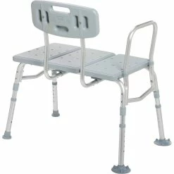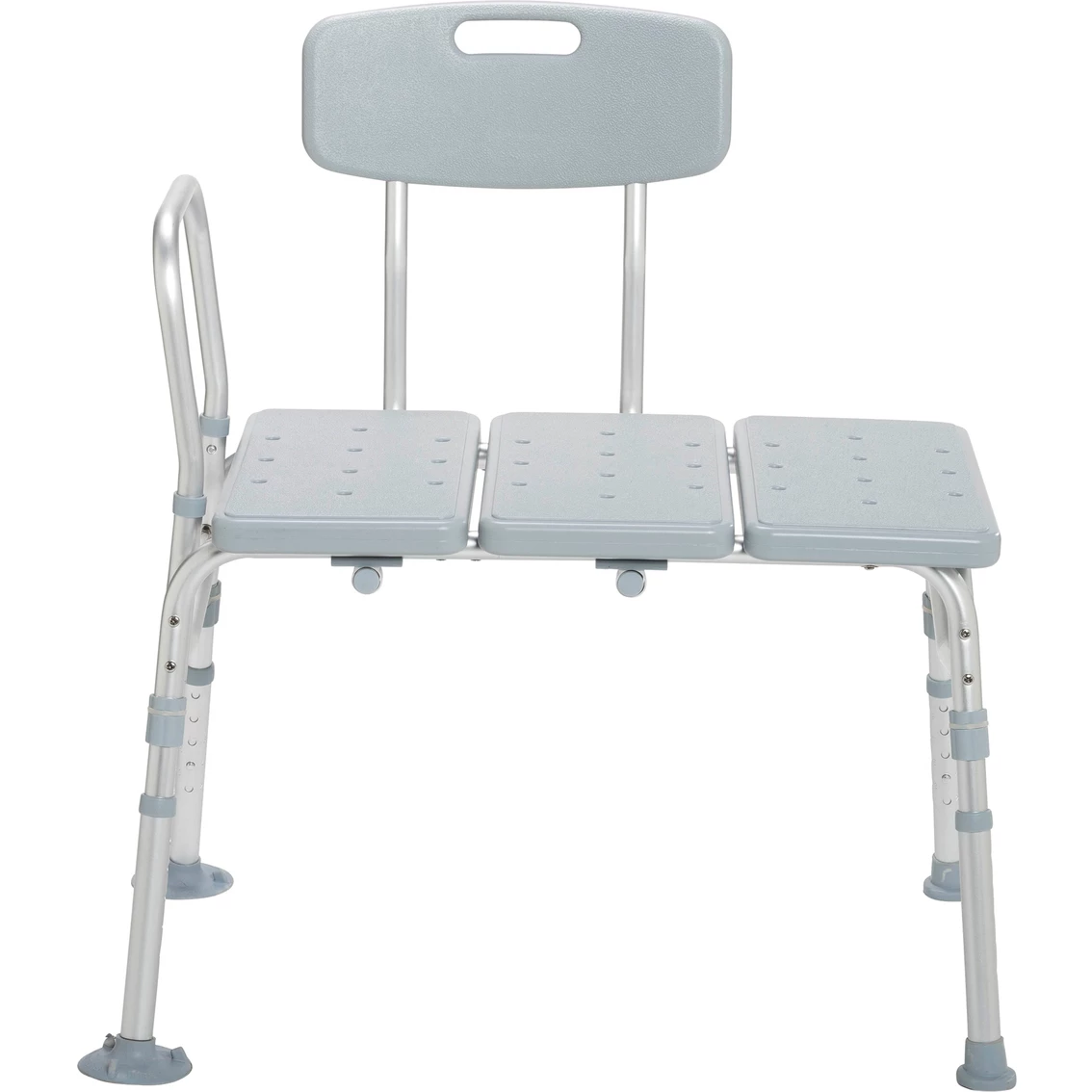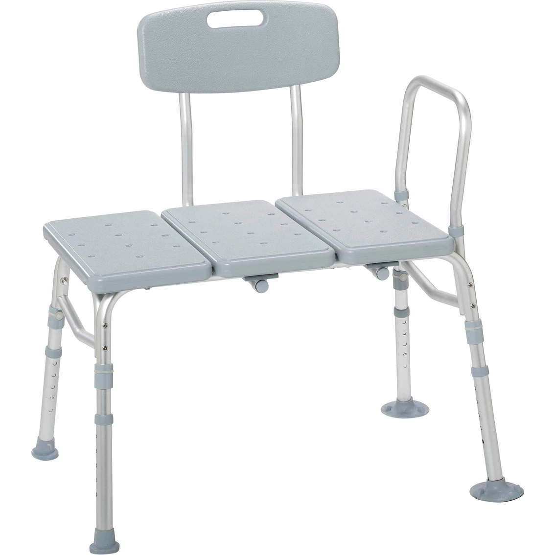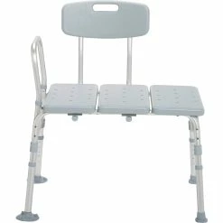 This plastic transfer bench by Drive Medical accommodates any bathroom because of its reversible bench and extension legs with extra-large suction cups that lock provide added versatility and safety. The “Dual Column” extension legs height adjust in 1/2 in. increments. Sturdy “A” frame construction, durable blow-molded plastic bench and backrest ensure maximum stability. This products features tool-free assembly leaving no hardware exposed. Style: 12011kd-1.