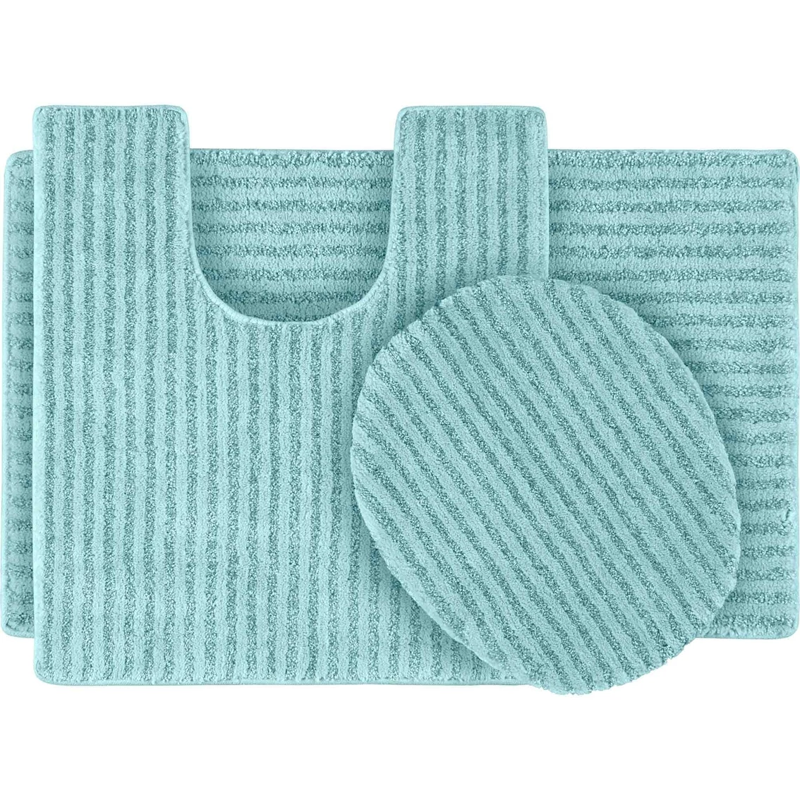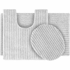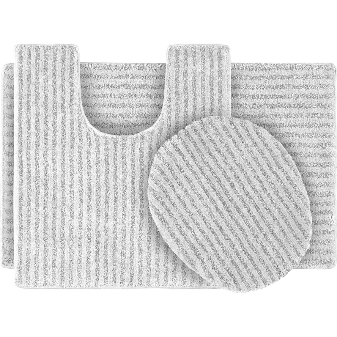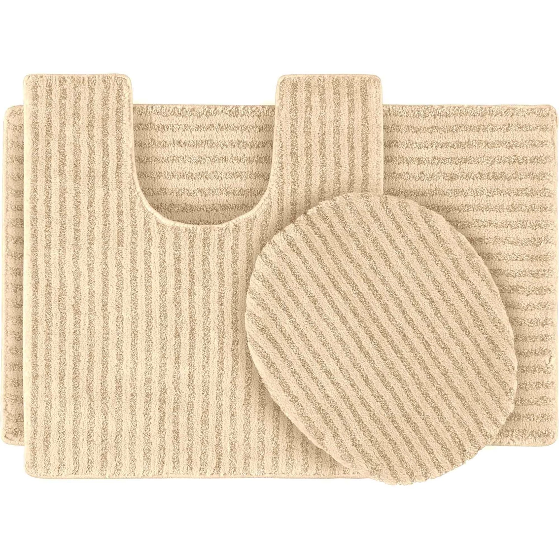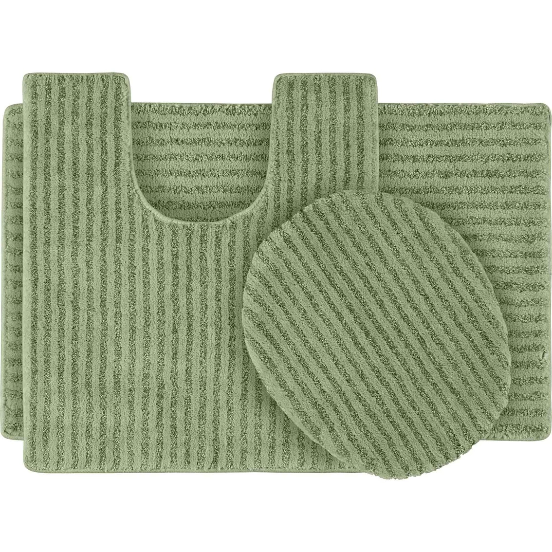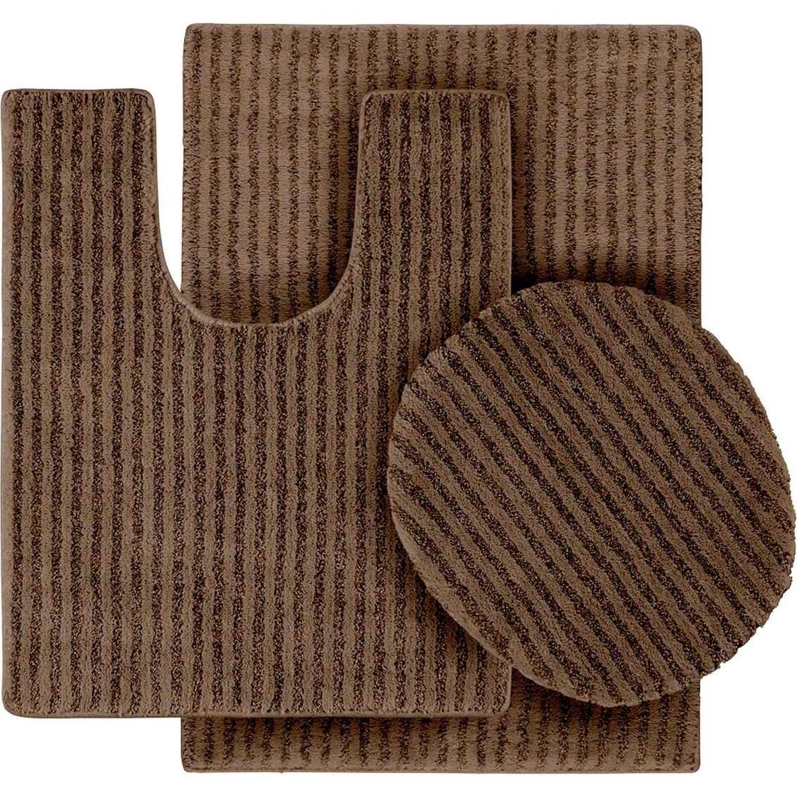 Beautify your bathroom and make your feet happy with these Sheridan Bath Rugs from Garland Rug. Set includes 19 x 22 in. cover, 21 in. x 24 in. contour and 21 in. x 34 in. mat. The distinctive stripe pattern reflects a modern, but yet traditional design that will compliment any bathroom decor. A nonskid backing keeps the rugs from sliding. Reinforced edges help prevent fraying. Sheridan rugs are proudly made in the USA with 100% nylon for superior softness and colorfastness.