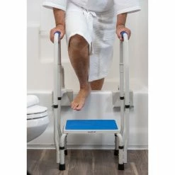 The Step 2 Tub from Step 2 Health is the essential bathroom safety fall prevention aid. To be used in the bathroom for anyone with mobility issues to help them get in-and-out of the tub safer. The extra-wide landing base and non-slip bath step prevent falls or slipping. Ideal for those who are struggling to move safely in and out of the bathtub due to a knee or hip injury/pain, for those who have decided to come home after surgery to recover, or those with limited mobility. Extra stability and security provided by a large, 12.5 in. x 11 in. step covered with non-slip material making it safe for anyone to shower or bathe with ease. Serves as your reliable bathtub assistance equipment. It combines an adjustable and extra-wide step set along with perpendicular handrail. The grab bar height is adjustable. It is lightweight, portable, yet study as it can hold up to 300 pounds. Dual Clamp System Secures your independence while getting in and out of the bathtub. These clamps have a strong locking mechanism that allows the rail to securely attach on to the sides of the bathtub. The clamp fits most size tubs so that it can be easily installed in just about any tubs. Model: 003.